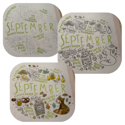 Das sind zwei kleine Auszüge der Smilies, die ich dazu gemalt habe, irgendwie stand der September im Zeichen meines Auto : D dazu aber unten mehr. Auch hier würde ich mich gerne noch mal auf neue Stifte stützen. Aber manchmal brauch es auch einfach seine Zeit, bis man so seine „Babys“ gefunden hat.