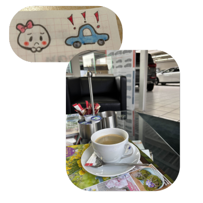 Nachdem Kirby also wieder beweglich war, ging es auf zum Tüv. Dies kann ich zum Glück ganz bequem bei meinem Autohaus erledigen, dort kommt der Tüv zwei mal die Woche. Meinen leckeren Kaffee habe ich dann in der gemütlichen Sitzecke mit gutem Lesestoff.